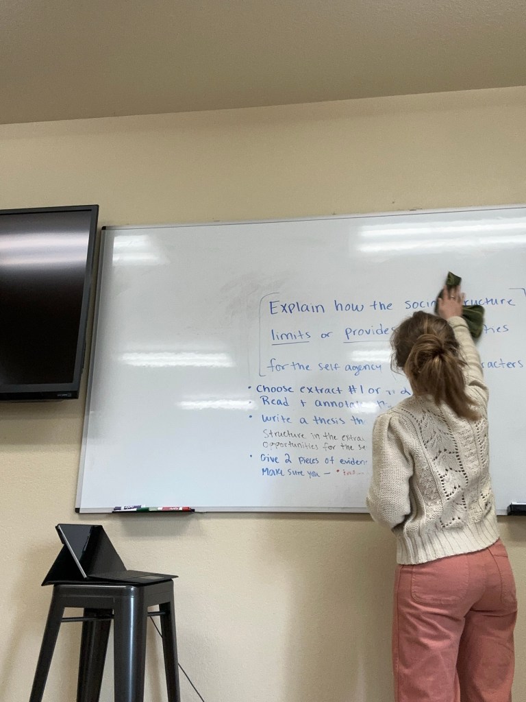 Sunlight pours through the window, golden and dusty as I wipe down the board with a stained yellow rag. It’s late afternoon and the cleaning cart is rumbling gently down the hallway. I hope they will be slow and give me my last few moments in this space. The essays are turned in, final remarks scrawled in the rubric margins, and well-wishes scribbled in yearbooks. I slide a rolling chair back into place and wipe some remaining eraser crumbs from a desk in the back, smiling because I know who sat here last.
